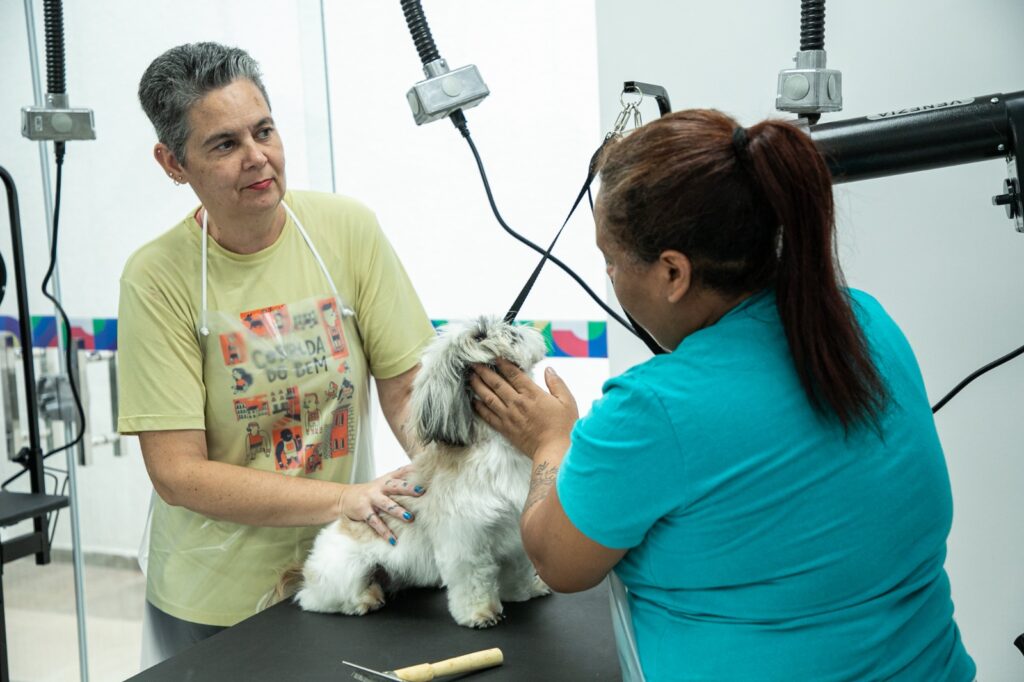 No curso, inicialmente em três turmas, são ensinadas técnicas de banho em cães, como corte de unhas, limpeza de orelhas, escovação de pelos, tosa higiênica e tosa geral. As aulas tiveram início dia 6 de maio, com 50 vagas ofertadas, além de mais 10 de cadastro reserva. O caso da Cláudia Aragão de Rosa, 48 anos, que faz o curso e ainda levou seu shih-tzu Snicker, de 1 ano, para ser modelo nas aulas práticas do curso de Banho e Tosa.