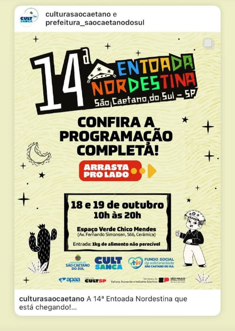 Nos próximos dias 18 e 19 de outubro, São Caetano do Sul realiza a 14ª edição da Entoada Nordestina. A festividade acontece no Espaço Verde Chico Mendes (Av. Fernando Simonsen, 566, bairro Cerâmica): sábado e domingo, das 10h às 20h. No destaque da programação, a banda Peixelétrico se apresenta no sábado às 19h e, no domingo, é a vez do grupo Balaio, também às 19h, encerrar as atividades.