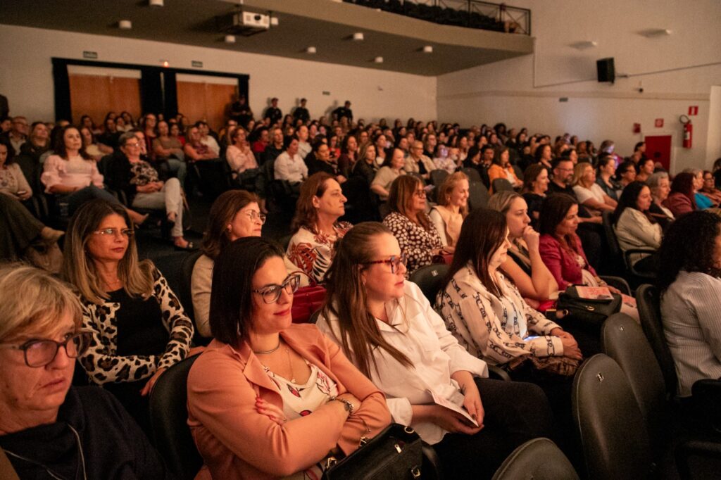 O Teatro Santos Dumont recebeu na noite desta terça-feira (14/10) o encontro “Falando Sério… Quando a 1ª Voz se Levanta, Nenhuma Mulher Fica Sozinha”, promovido pelo Fundo Social de Solidariedade de São Caetano do Sul. O evento reuniu 300 mulheres em um bate-papo necessário sobre o tema violência contra a mulher.