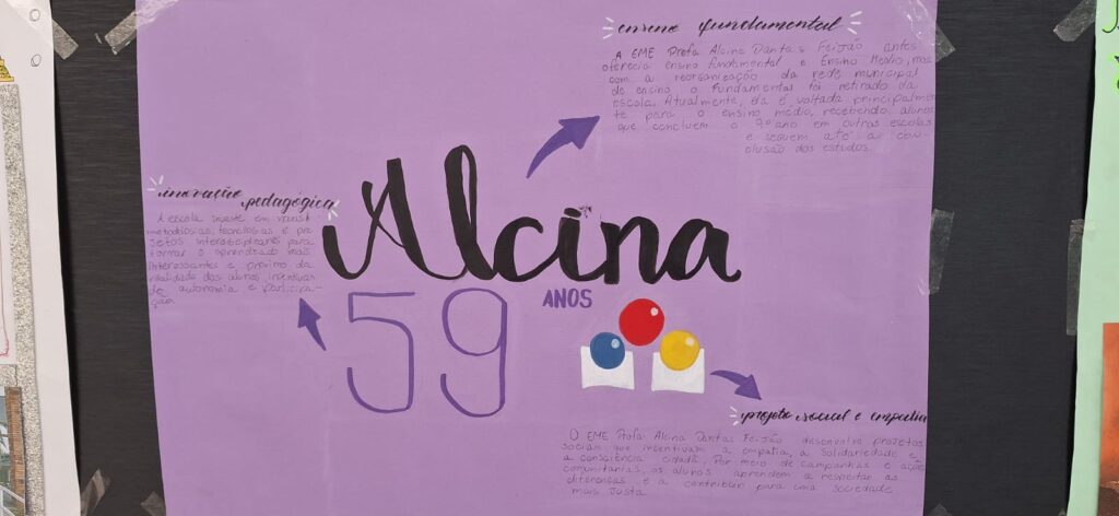 A programação mobilizou estudantes em atividades criativas e colaborativas. Como parte da Gincana Solidária tradicionalmente e anualmente organizada pela escola, cada equipe de alunos foi responsável por produzir cartazes com três curiosidades sobre a história do Alcina, formando um mural coletivo. O resultado foi um painel colorido e informativo que destaca momentos e características marcantes da trajetória da instituição.